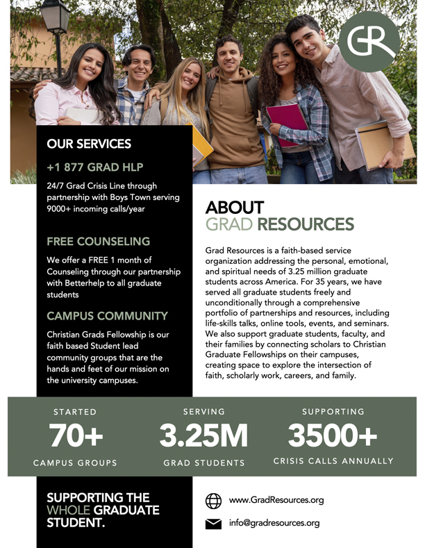 Today, Grad Resources is active and thriving, expanding our tools to address the struggles of graduate students and providing supportive faith-based communities. The National Grad Crisis Line continues to receive calls every month from graduate students looking for emotional support. Our advice and counsel continue to be requested by dean’s offices and press outlets while students readily consult our online resources.